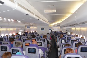 Přední kabina Boeingu 747 Corsairu, který má svá Jumba v úpravě pro 582 cestujících - což je v současnosti nejvyšší počet sedaček v dopravním letadle.