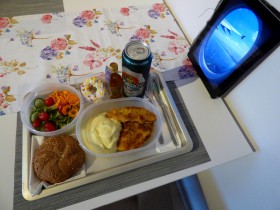 Domácí náhrada za oběd, který měl být podáván na zrušeném letu: Vepřový řízek s bramborovou kaší, okurkovo-mrkvový salát s rajčaty a slunečnicovými semínky + pečivo, minidonut. Nápoje: pivo desítka, metaxa.