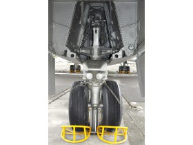 Levá dvojice motorů Pratt and Whitney JT3D-3B. Tyto motory neměly možnost odebírat stlačený vzduch od kompresoru pro systémy letadla a proto byl na motorech číslo 2 a 3 umístěn mechanicky poháněný kompresor se vstupem vzduchu v horní části motorové gondoly.
