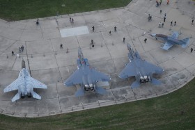 • Letecký pohled na záložní letiště na dálnici D1 nedaleko Měřína. Na fotografii jsou dobře vidět obě stojánky na každém z obou konců letiště a rovněž absence travnatého dělícího pásu. Toto letiště bylo skutečně využito k přistání během několika cvičení a to letouny MiG-21MF od 9. slp, MiG-23BN a později i Su-25. Letouny Su-7 tehdy na letiště nepřistávaly, jelikož jejich sedačky neměly parametry 0/0. Během cvičení se dálnice na řádově týdny uzavřela. Sloužilo jako záloha nedalekého letiště Náměšť nad Oslavou.