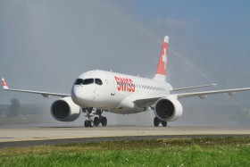 Bombardier CSeries Welcome Ceremony - Water-cannon salute for the brand new type between Zürich and Budapest.