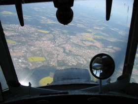 Ano, je to pohled z kokpitu WHBčka na Plzeň při klesání z výsadku 9000ft.